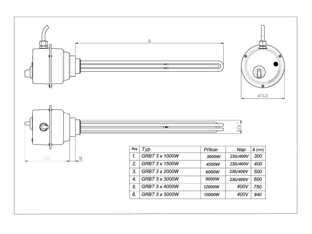 Kompletní topná tělesa pro ohřívače vody s vestavěným termostatem a tepelnou pojistkou. Jsou nejlepším řešením při potřebě ohřevu většího množství vody. Topná tělesa jsou přizpůsobena ke spolupráci s externím řízením. Kvalitu práce a spolehlivost zajišťuje vestavěný třífázový termostat firmy COTHERM s možností nastavení spínání v oblasti 20-70 stupňů Celsia a obsahující integrovaný bezpečnostní omezovač teploty rozepínající při teplotě 90 stupňů Celsia. U těchto příkonů zvažte objem ohřívané vody a délku prostoru pro topný element.