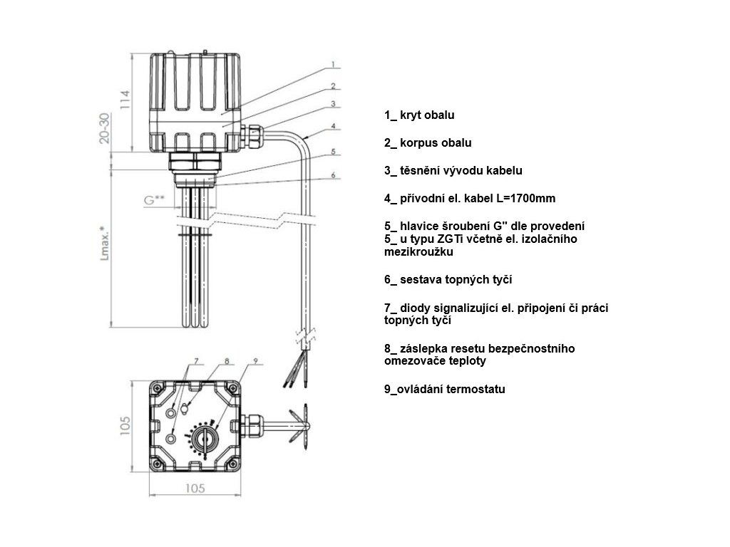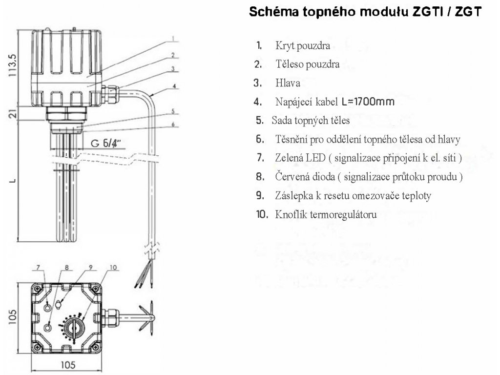 Izolace topných těles je dosaženo jejich montáží do příruby izolované od hlavy z nerezu, včetně závitové části.