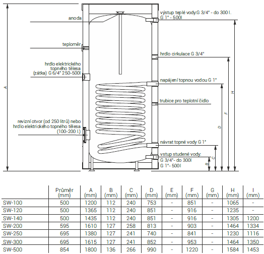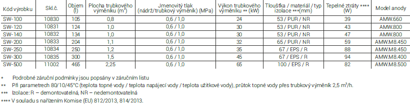 Kombinovaný bojler typu "SW" dodáváme v litrážích 100 až 500 litrů. Kombinovaný bojler SW obsahuje jeden výměník umístěný v dolní části nádrže, která je elektrostaticky smaltovaná. Tato moderní technologie umožňuje zajistit přesnou, rovnoměrnou tloušťku ochranného povrchu která spolu s vyšší elasticitou významně přispívá k významnému zvýšení odolnosti zásobníku proti korozi, prorezivění. Zásobník je vybaven kolekcí vstupů tak, aby bylo možno jej využít v mnoha variantách zapojení instalací. Tento bojler je možno rovněž vybavit elektrickým ohřevem - modulem s autonomním řízením teploty ohřevu.