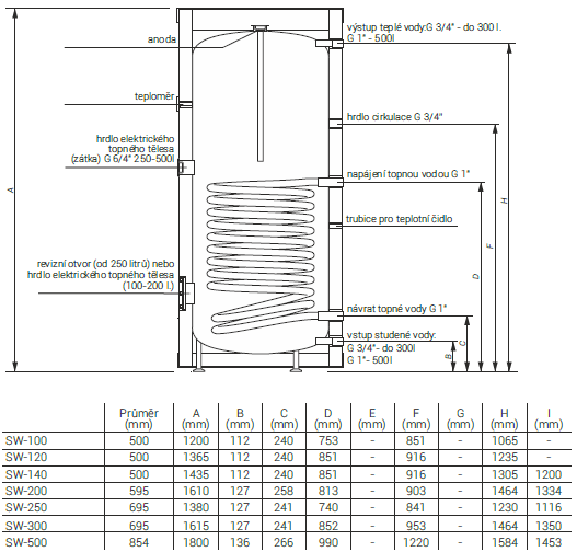Kombinovaný bojler typu "SW" dodáváme v litrážích 100 až 500 litrů. Kombinovaný bojler SW obsahuje jeden výměník umístěný v dolní části nádrže, která je elektrostaticky smaltovaná. Tato moderní technologie umožňuje zajistit přesnou, rovnoměrnou tloušťku ochranného povrchu která spolu s vyšší elasticitou významně přispívá k významnému zvýšení odolnosti zásobníku proti korozi, prorezivění. Zásobník je vybaven kolekcí vstupů tak, aby bylo možno jej využít v mnoha variantách zapojení instalací. Tento bojler je možno rovněž vybavit elektrickým ohřevem - modulem s autonomním řízením teploty ohřevu.