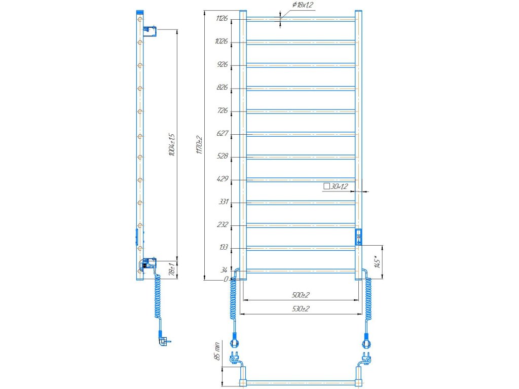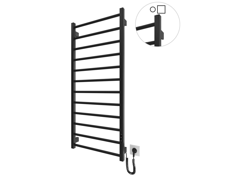 Elektrický koupelnový radiátor HF Leeds o rozměru 1170 x 530 mm funguje na technologii suchého topného tělesa. Je vybaven vestavěným časovačem - regulátorem a konektorem pro připojení k napájení z jakékoli strany. Součástí je sada pro skryté připojení. Model má 12 žeber z kulaté trubky a hřeben z čtvercového profilu. Materiál černá ocel s antikorozní úpravou. Teplotní režimy časovače-regulátoru: 40 °C, 45 °C, 50 °C. Doba provozu: 3, 6 hodin nebo trvalý ohřev.